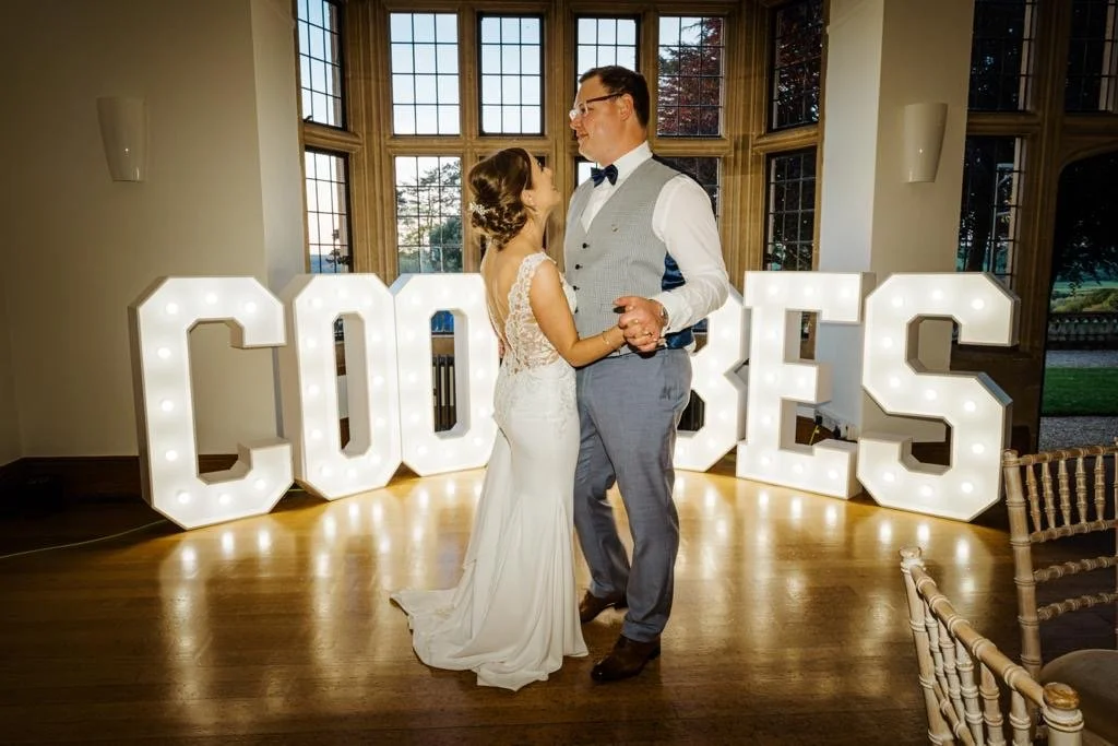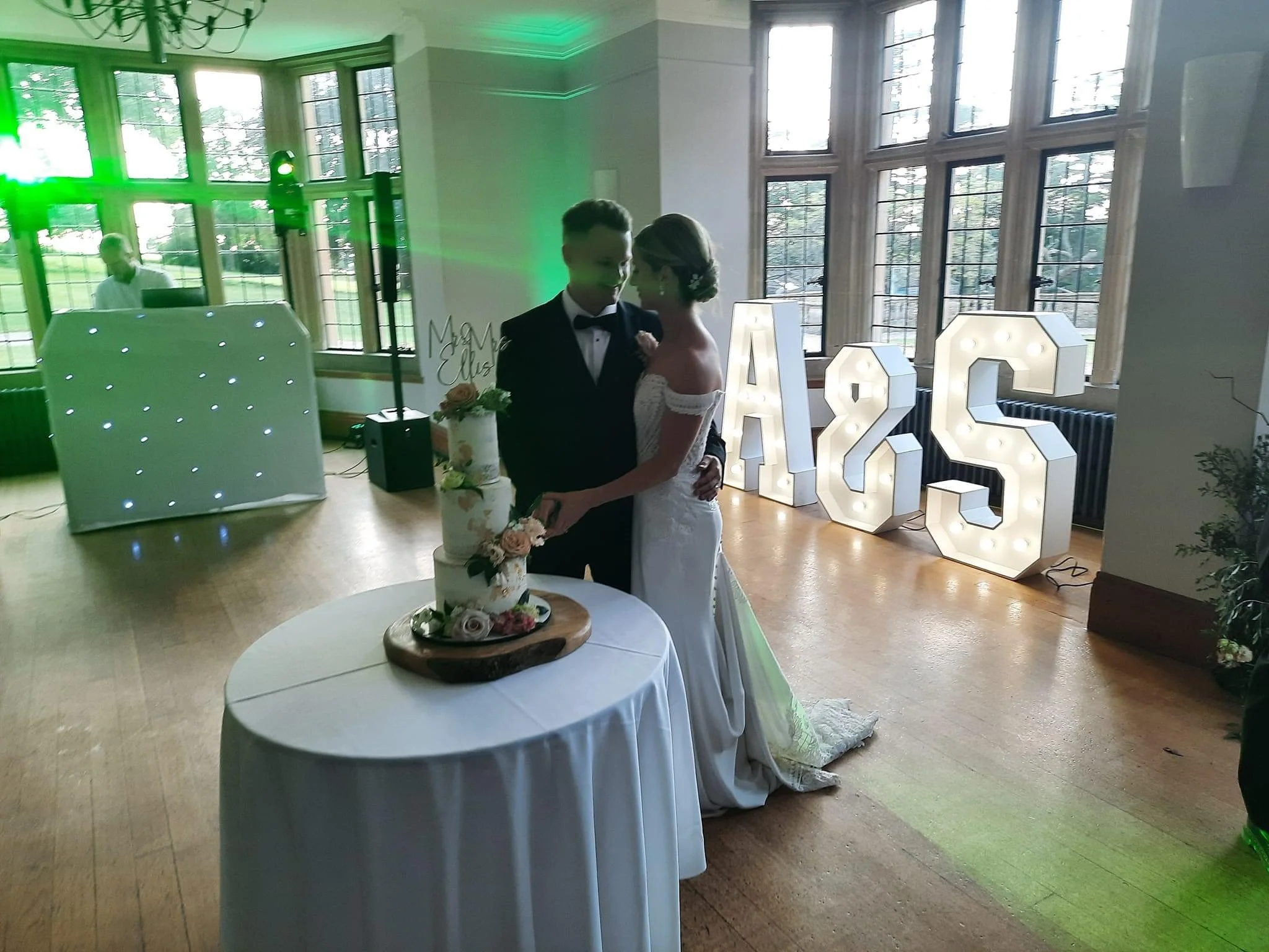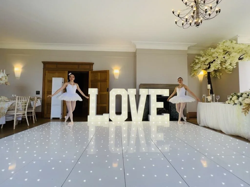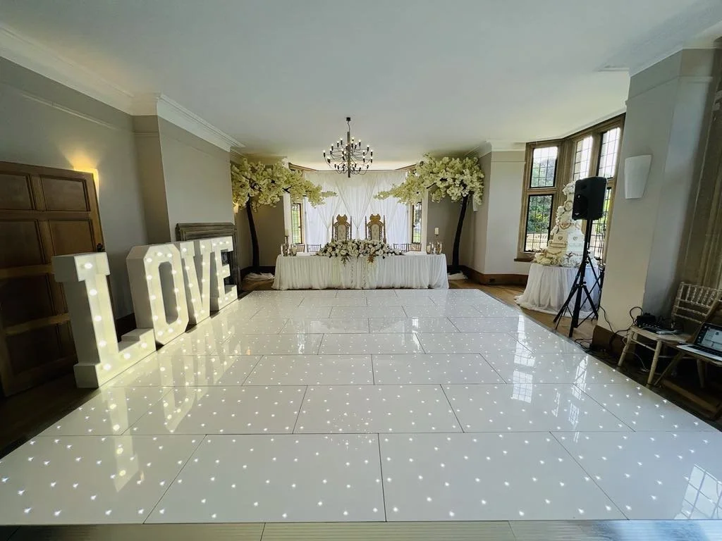 To the left you will see a selection of photos from previous weddings at Deer Park which include our different DJ set ups, 4ft Dimmable Letter Lights, uplighting, led Dance Floors and more.
